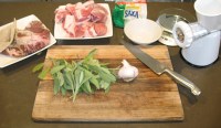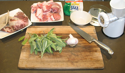 Once I had all the ingredients ready I chopped up 10g of sage, crushed up 25g of rock salt, 3 cloves of garlic and trimmed the fat off the 1.3kg of pork so I could measure the fat ratio (ended up with approx 400g of fat which is 31% of total meat).
